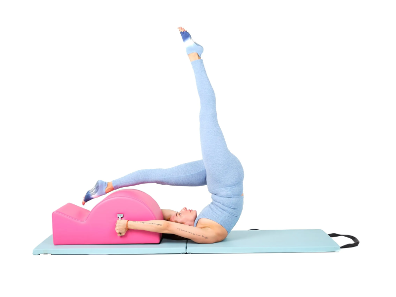 - Hít vào, thực hiện Roll Over: uốn cong hông để gập chân về phía thân, sau đó lần lượt gập cột sống ra khỏi thảm từ xương cụt đến vùng lưng trên. Giơ chân lên cao, song song với thảm.